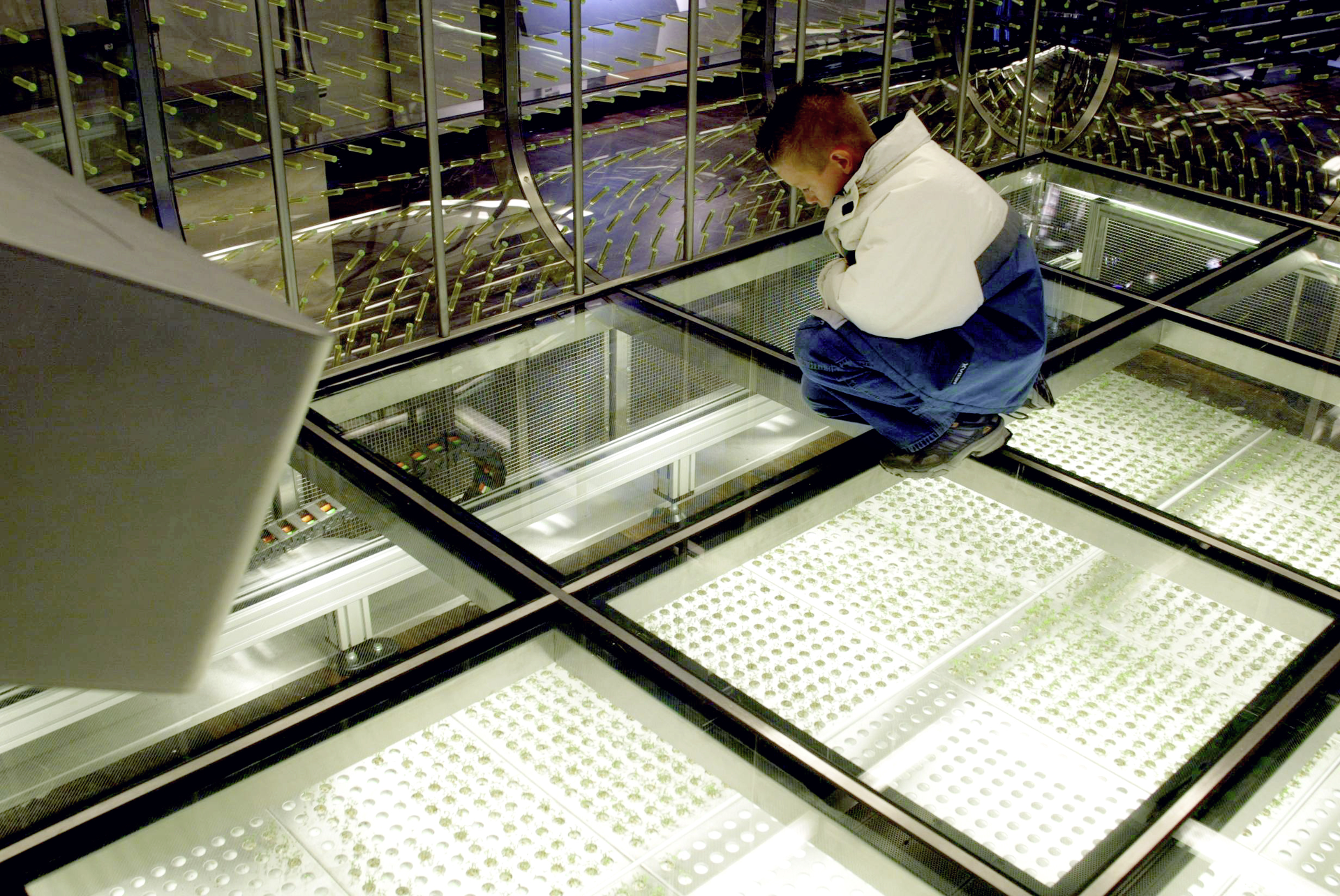 Jeder Besucher des SunFuel Labs kann seine eigene, personalisierte Pflanze aussäen und diese dann von Zuhause aus im Internet beobachten. Auf diese Weise nehmen die Besucher am Entstehungsprozess von SunFuel selbst teil und werden über den Tag des Ausstellungsbesuches hinaus involviert. Mit seiner transparenten Fassade schwebt das SunFuel Lab scheinbar einen halben Meter über den Boden. Über eine Treppe gelangt der Besucher in das Innere dieses eigenartigen Ortes. Zu seinen Füßen, unter dem Glasboden, sieht er Felder mit wachsenden Pflanzen. Der Roboter ist ständig in Bewegung, sät Pflänzchen aus, und fotografiert sie. Das Projekt wurde von uns konzipiert, gestaltet, geplant und anschließend vor Ort realisiert. Architekten, Film- und Webdesigner, Programmierer und Projektleiter waren an den verschiedenen Bereichen des Projektes beteiligt.